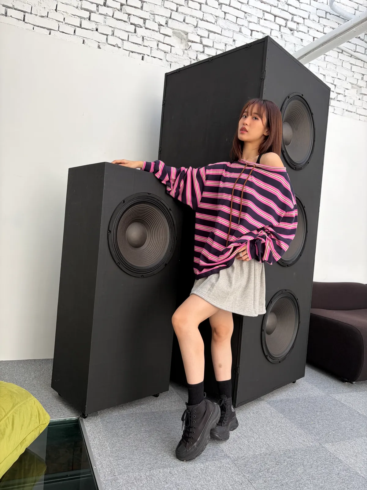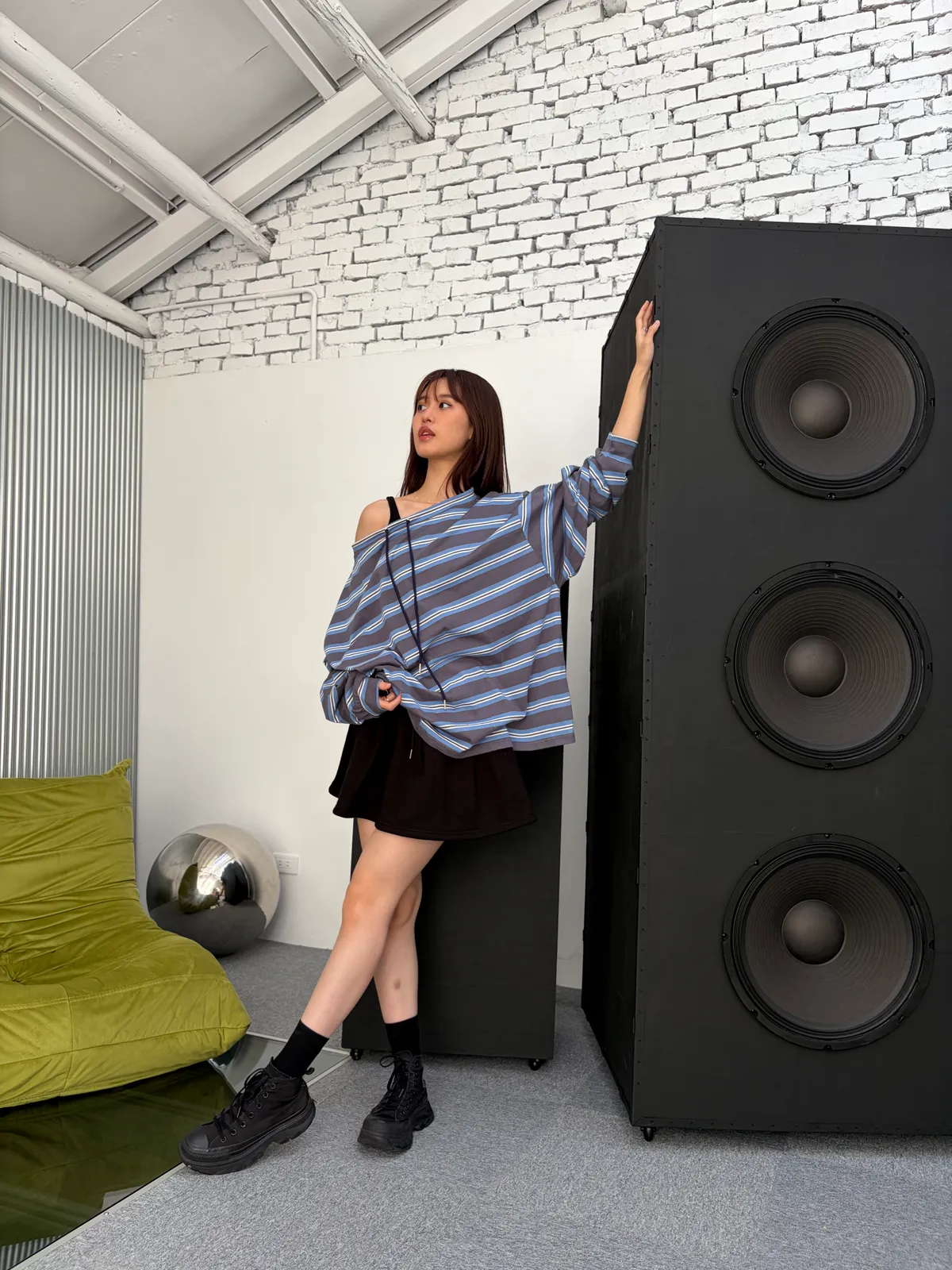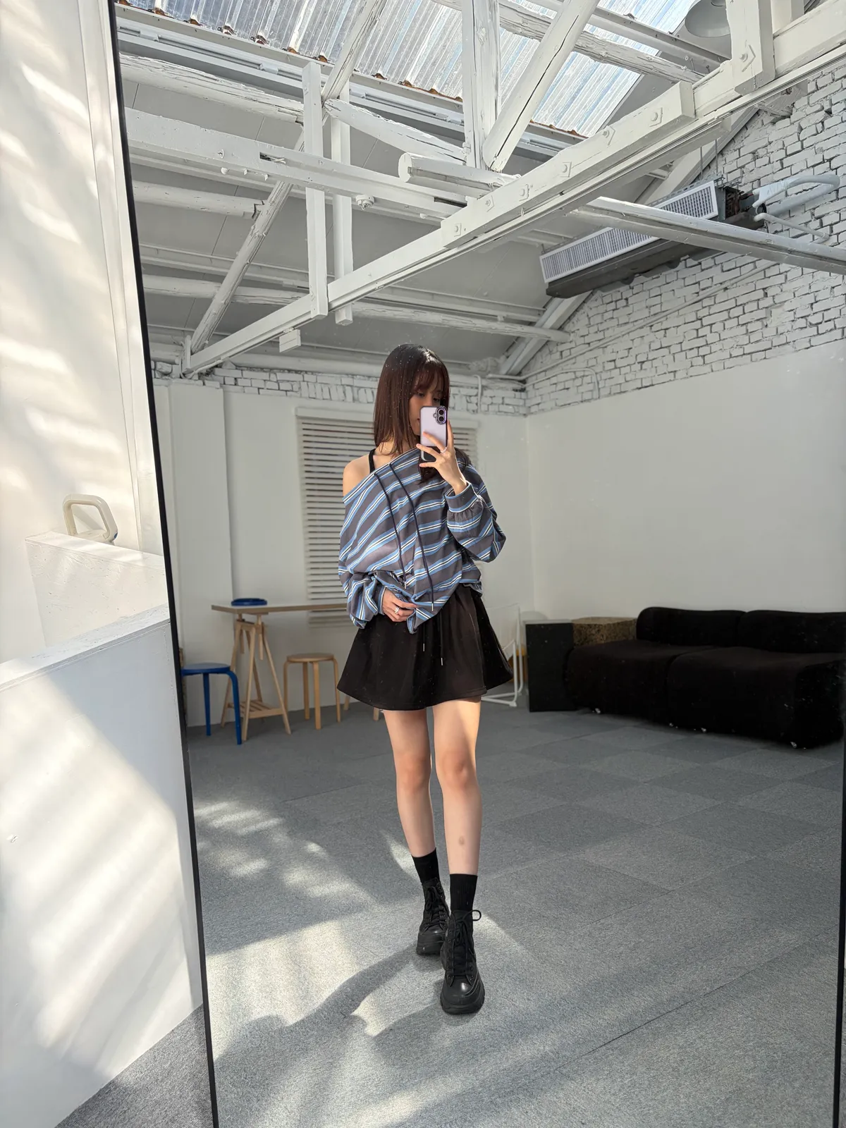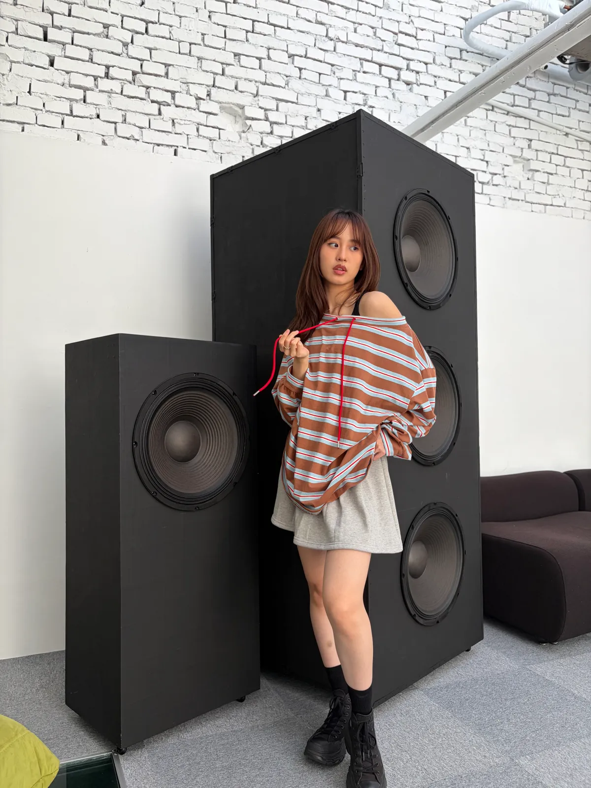這件上衣以寬鬆落肩 × 不規則下擺打造自然鬆弛感,