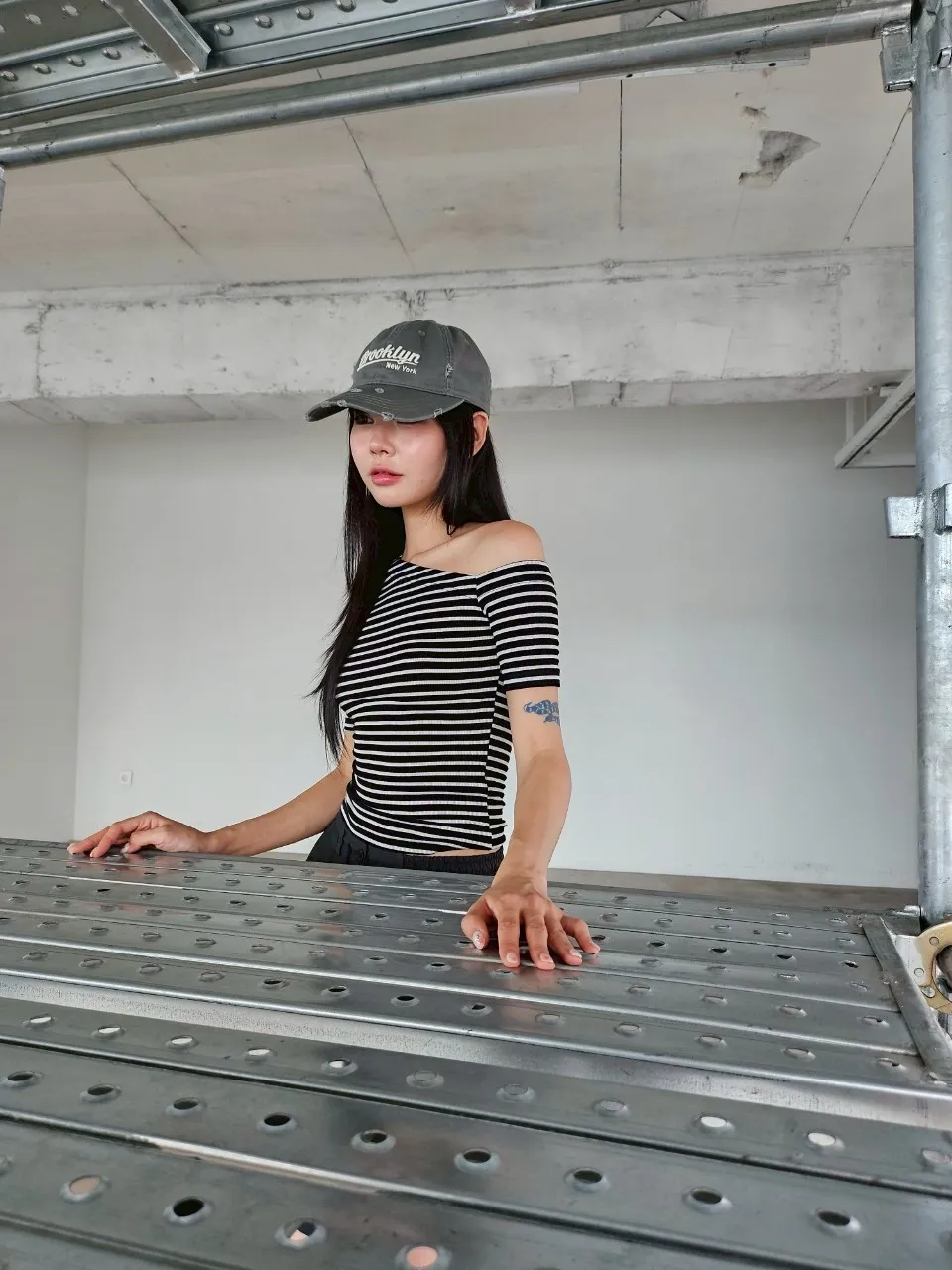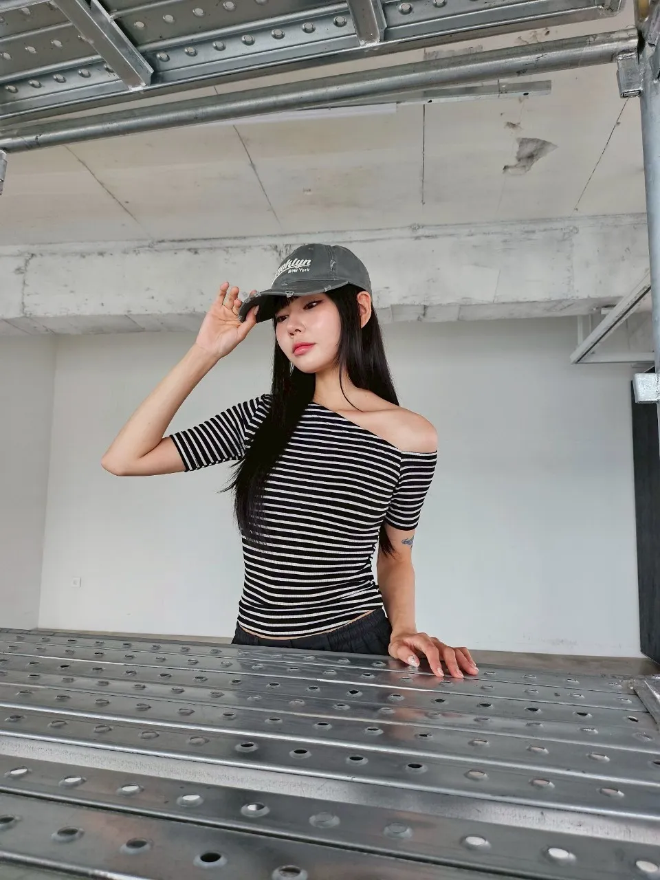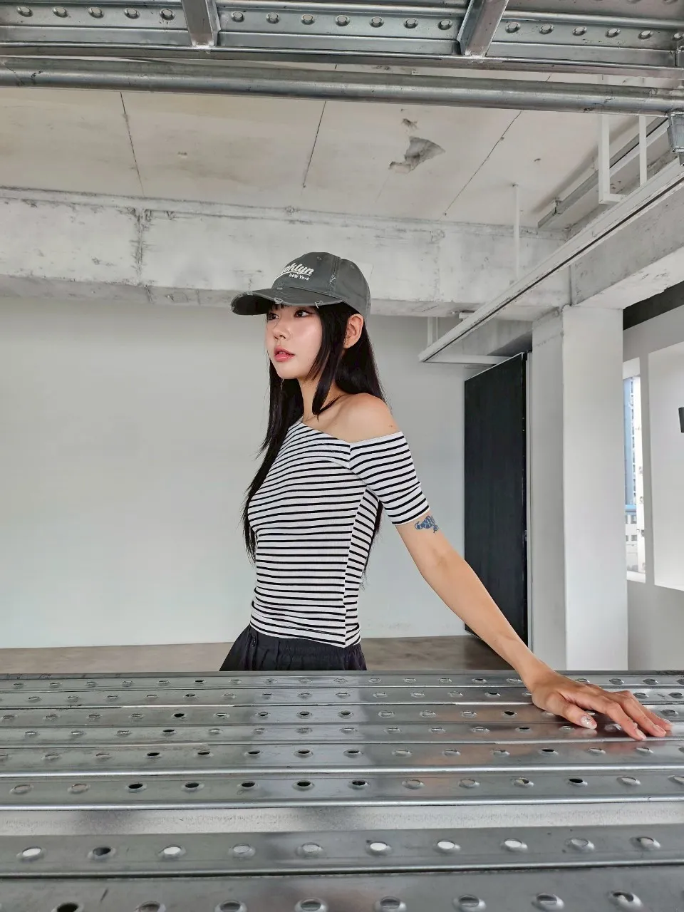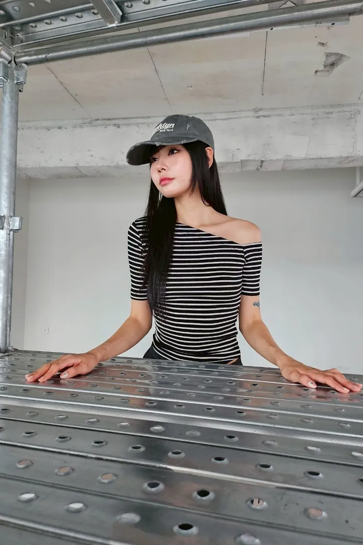 設計感十足的斜肩剪裁條紋上衣,利用不對稱設計+貼身版型