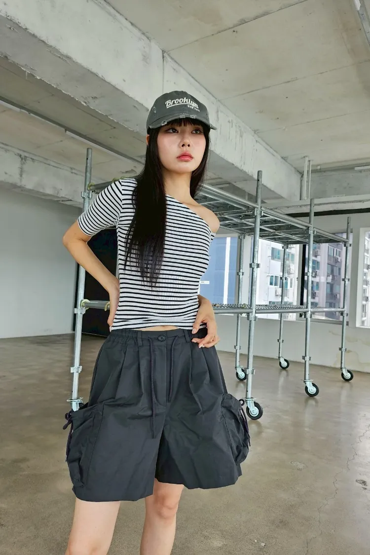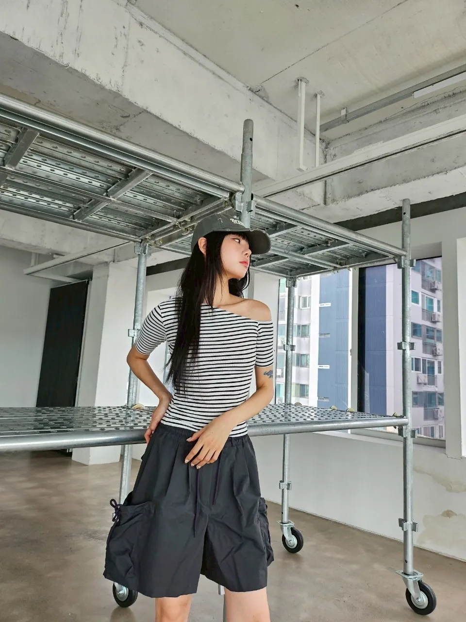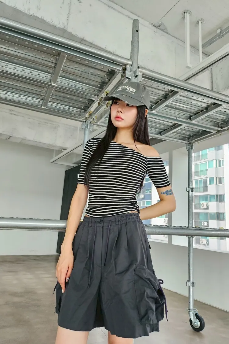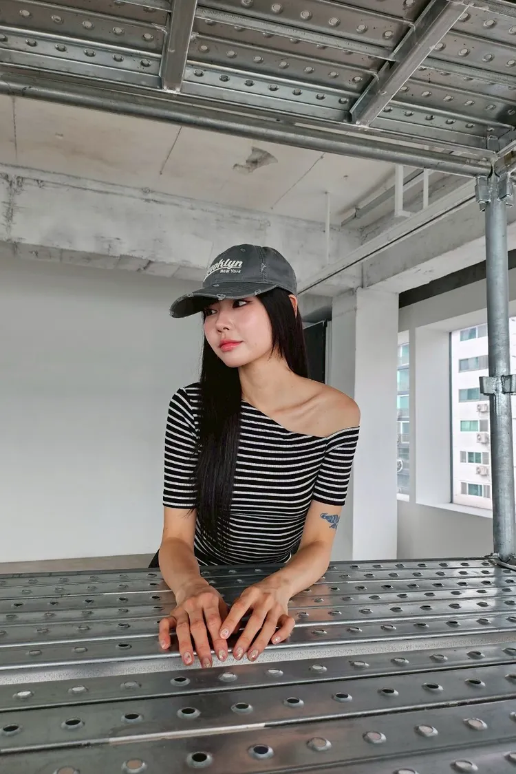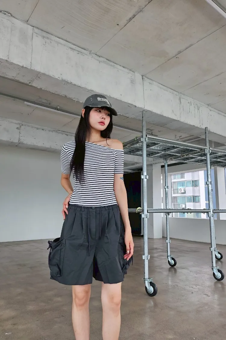 設計感十足的斜肩剪裁條紋上衣,利用不對稱設計+貼身版型