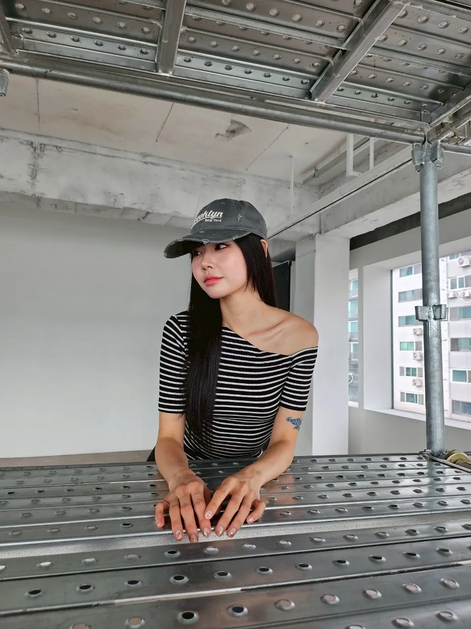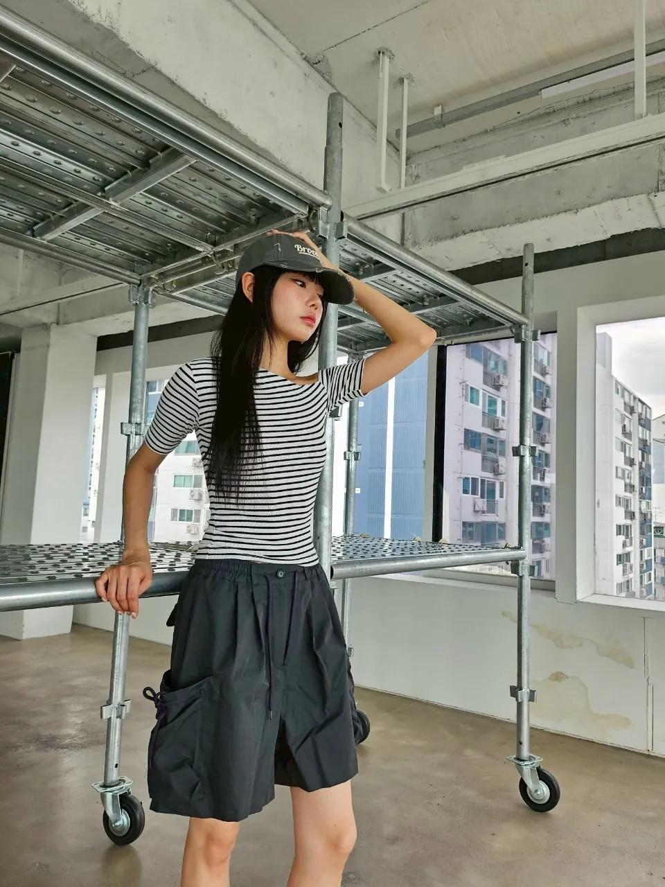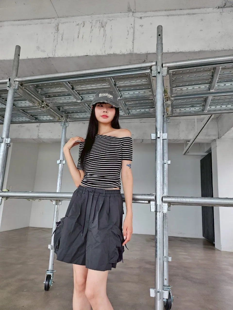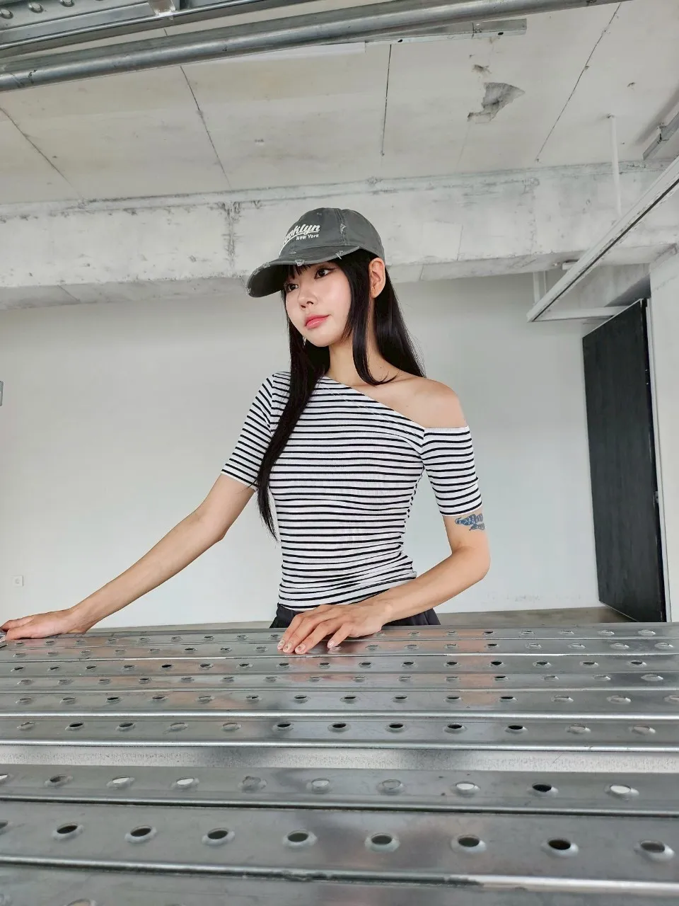 設計感十足的斜肩剪裁條紋上衣,利用不對稱設計+貼身版型