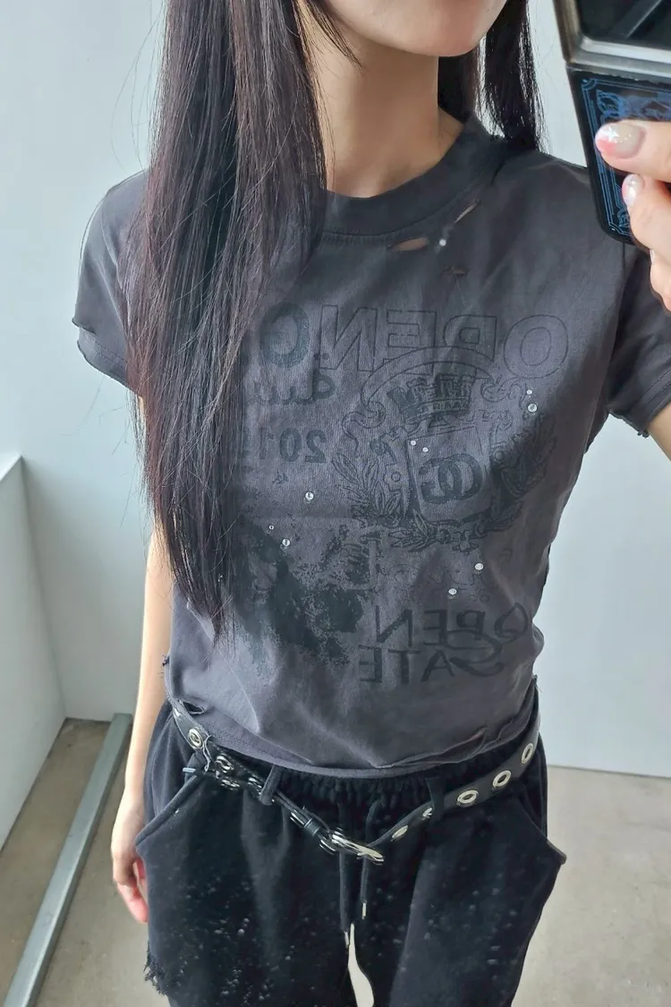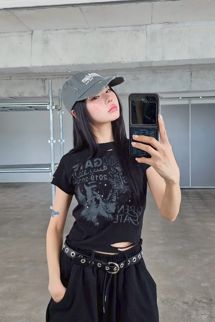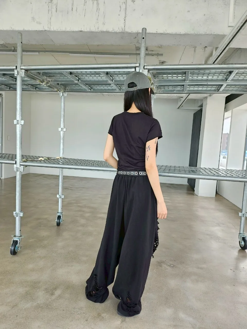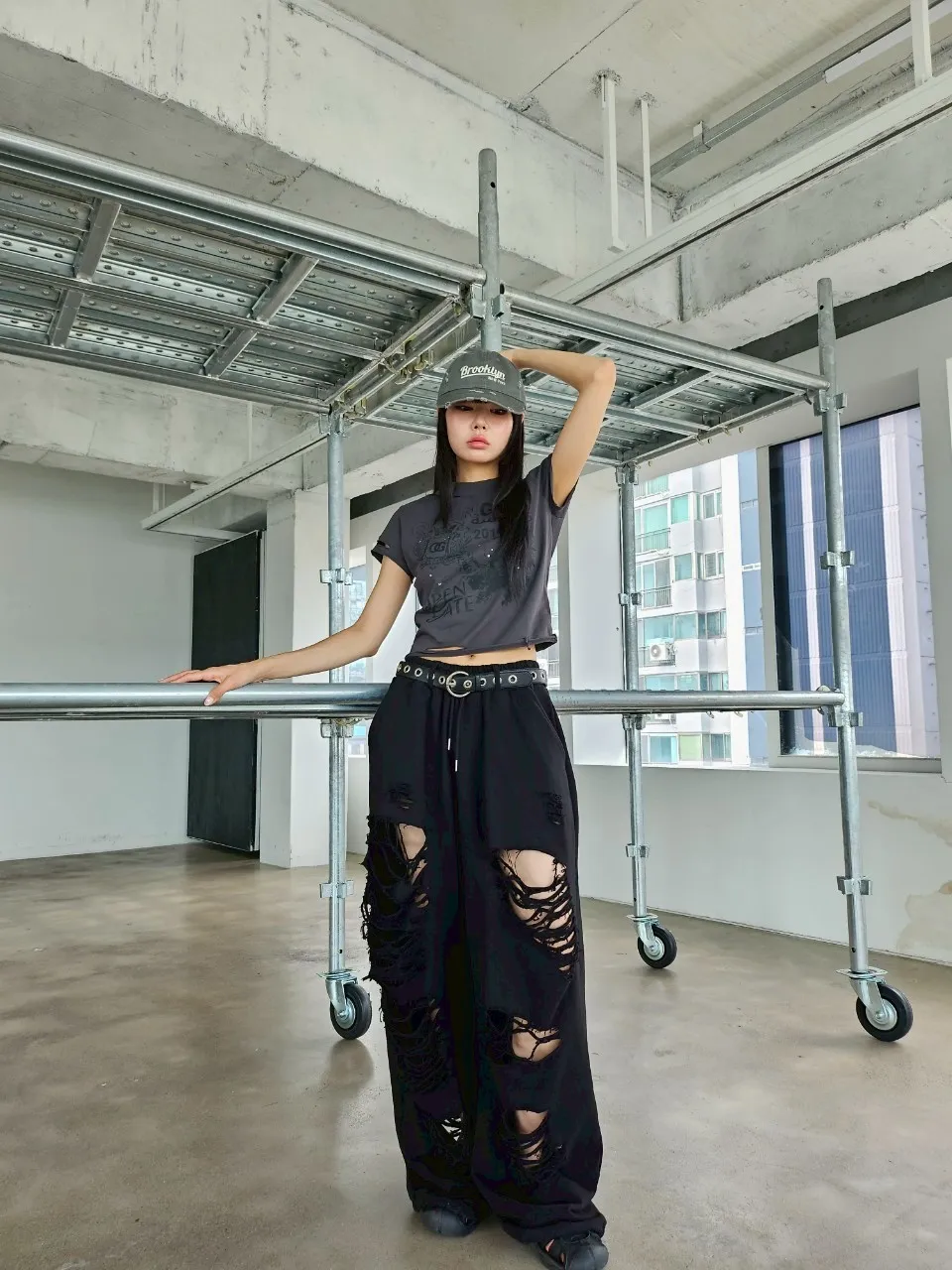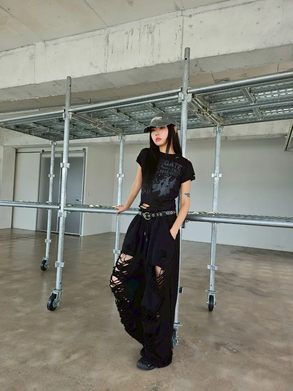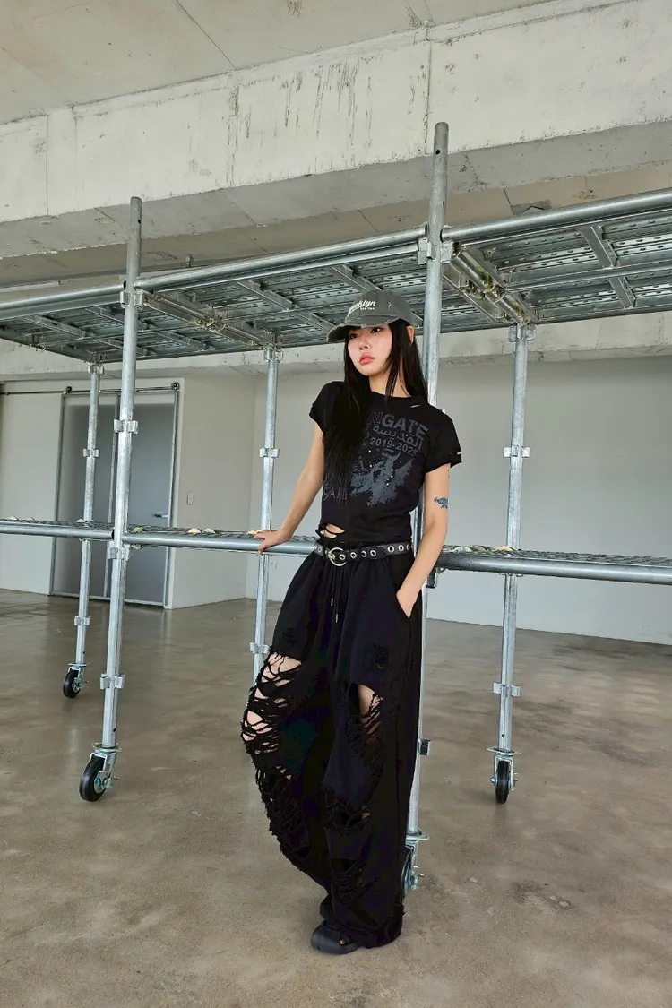 不對稱破壞剪裁,領口、袖口與下擺皆有手工感破洞設計,營造出隨性街頭氛圍
