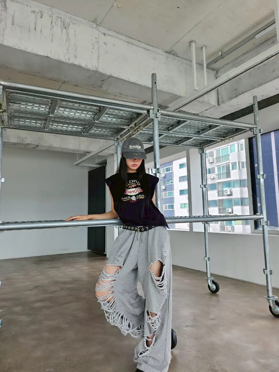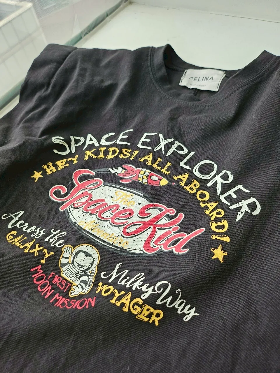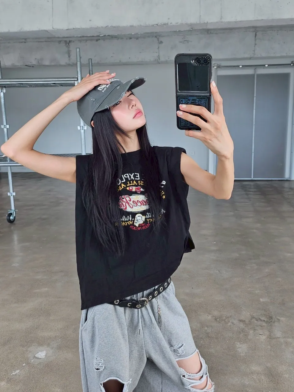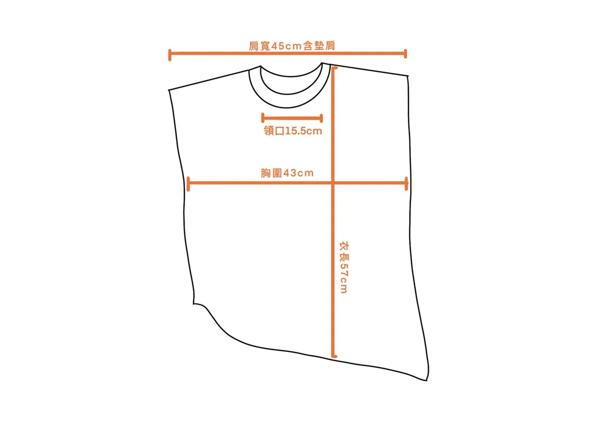 胸前斑駁處理的美式印圖帶出街頭感,下擺採不對稱斜角剪裁