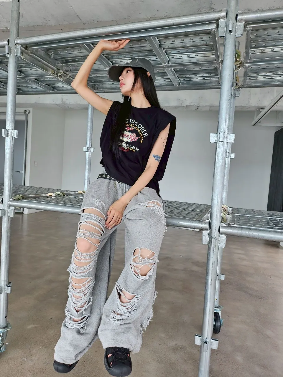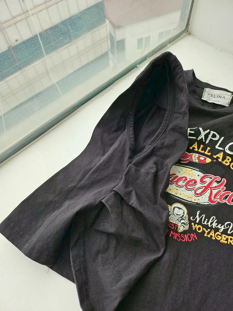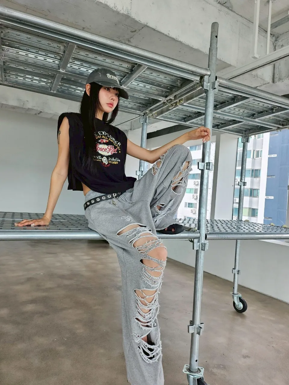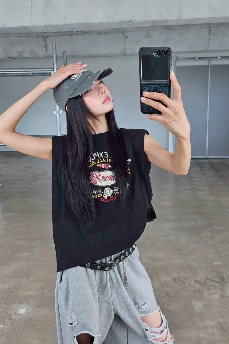 胸前斑駁處理的美式印圖帶出街頭感,下擺採不對稱斜角剪裁
