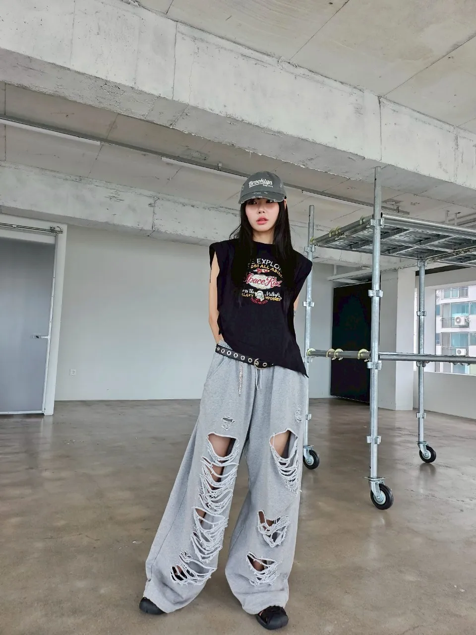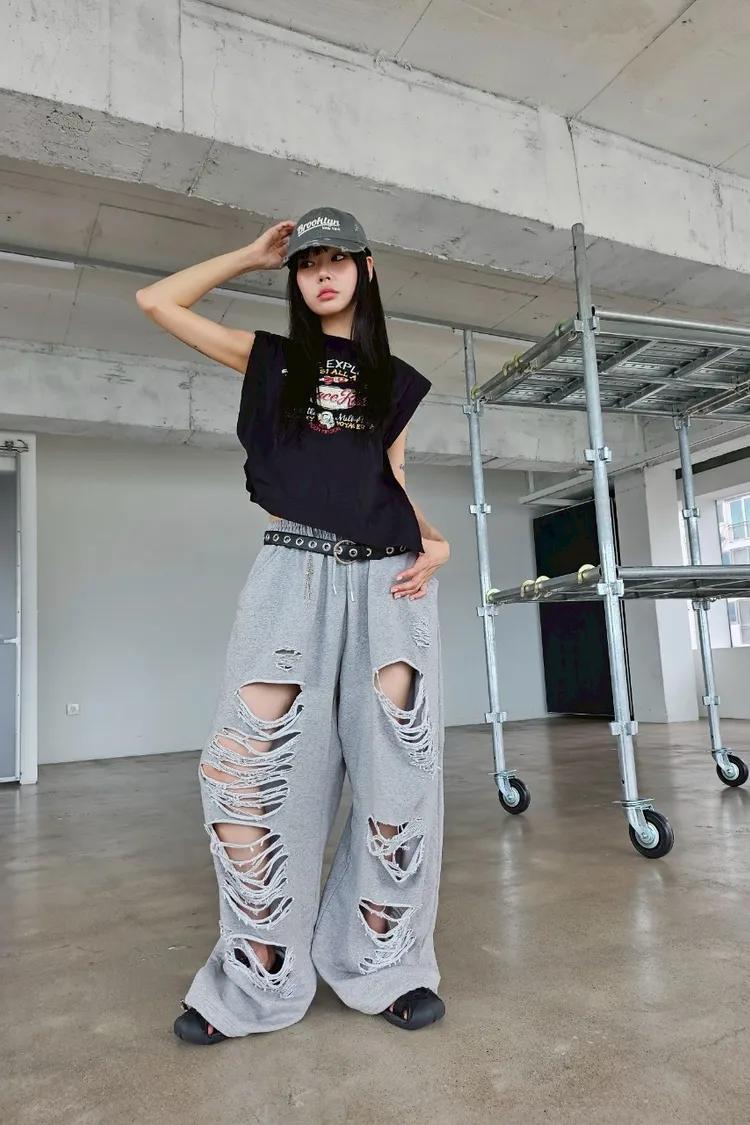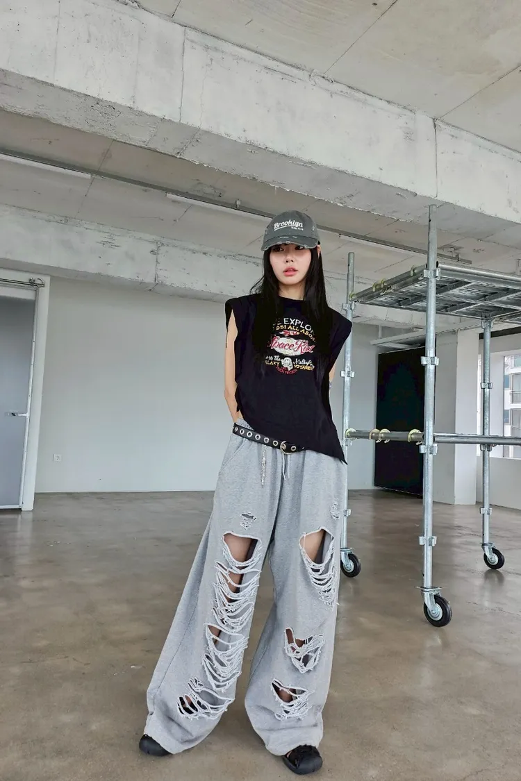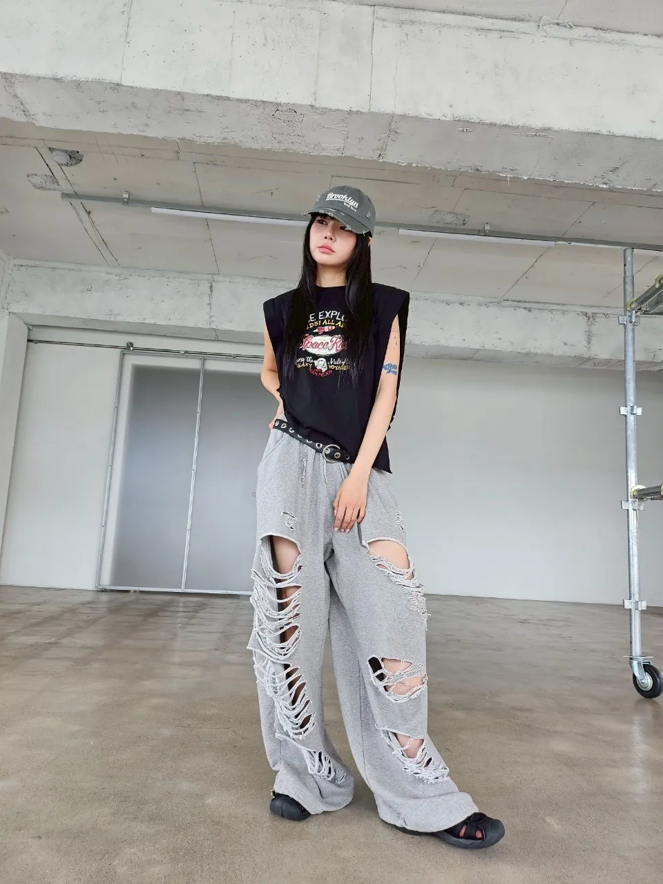 胸前斑駁處理的美式印圖帶出街頭感,下擺採不對稱斜角剪裁