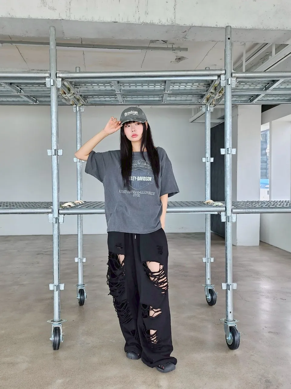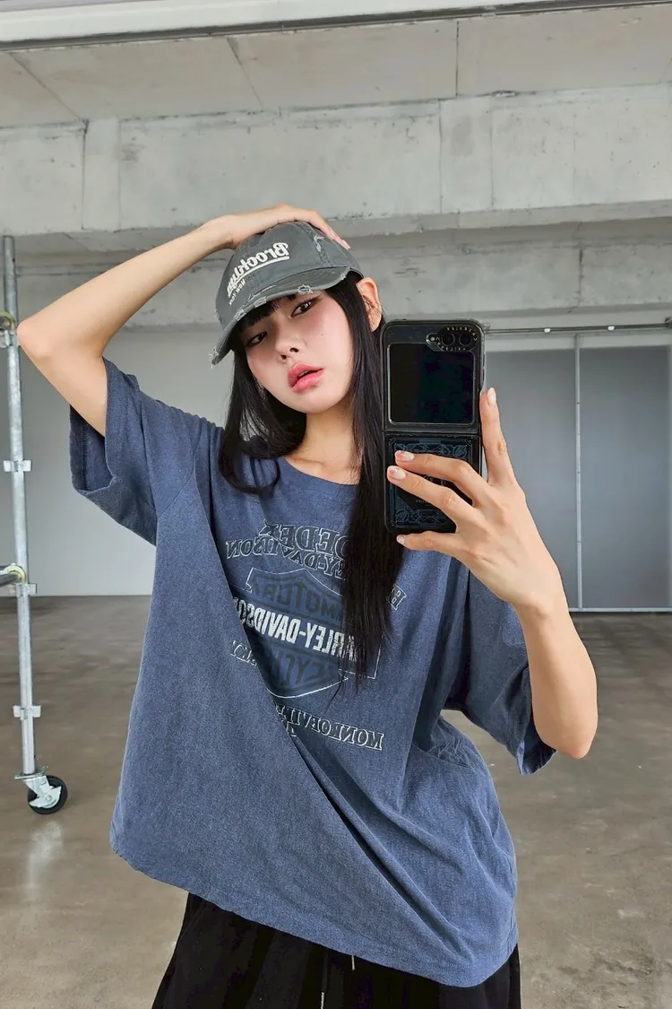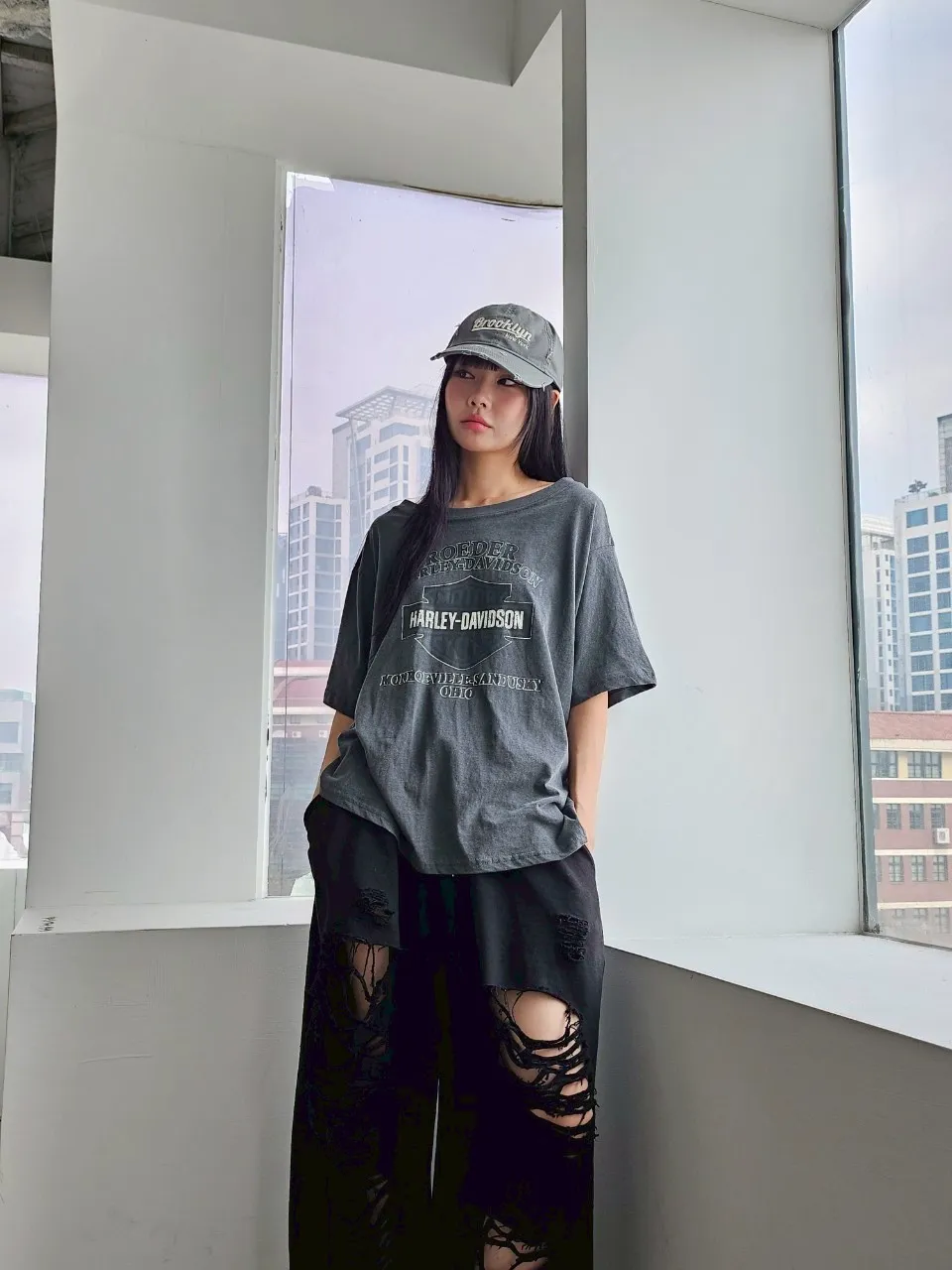胸前以斑駁刷舊字樣印刷打造街頭風格
